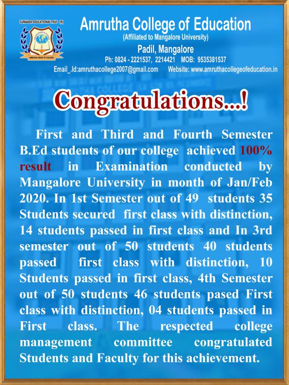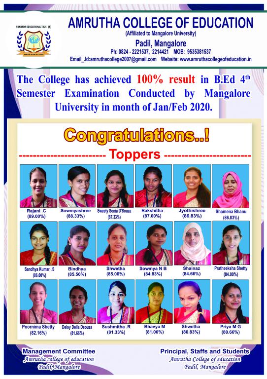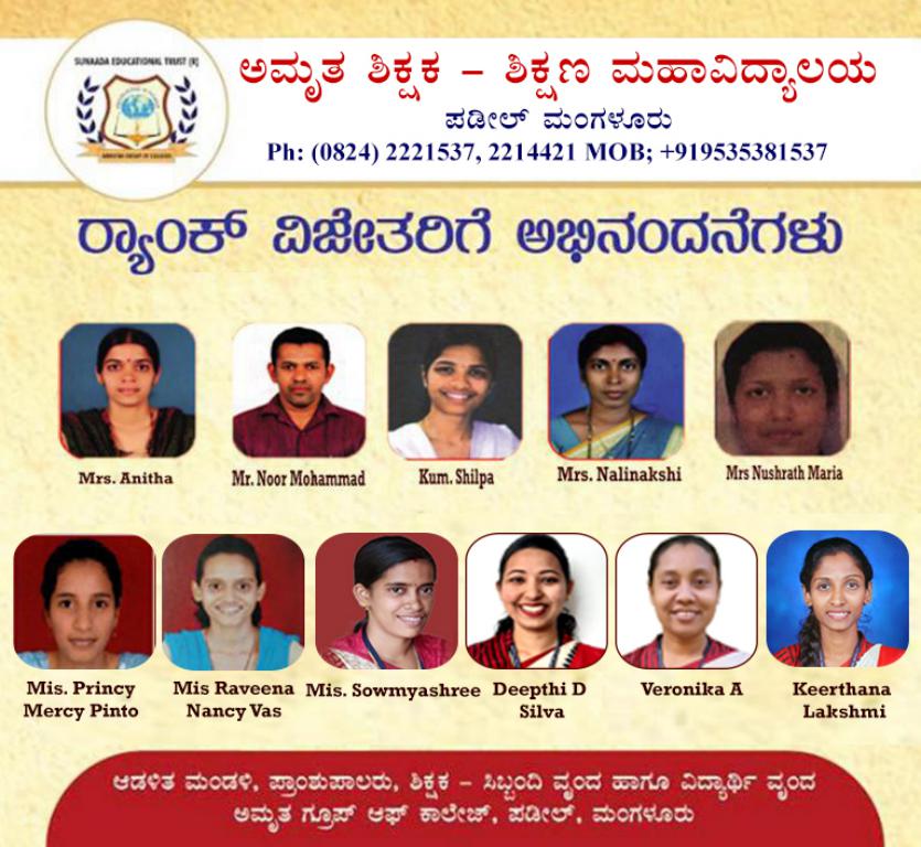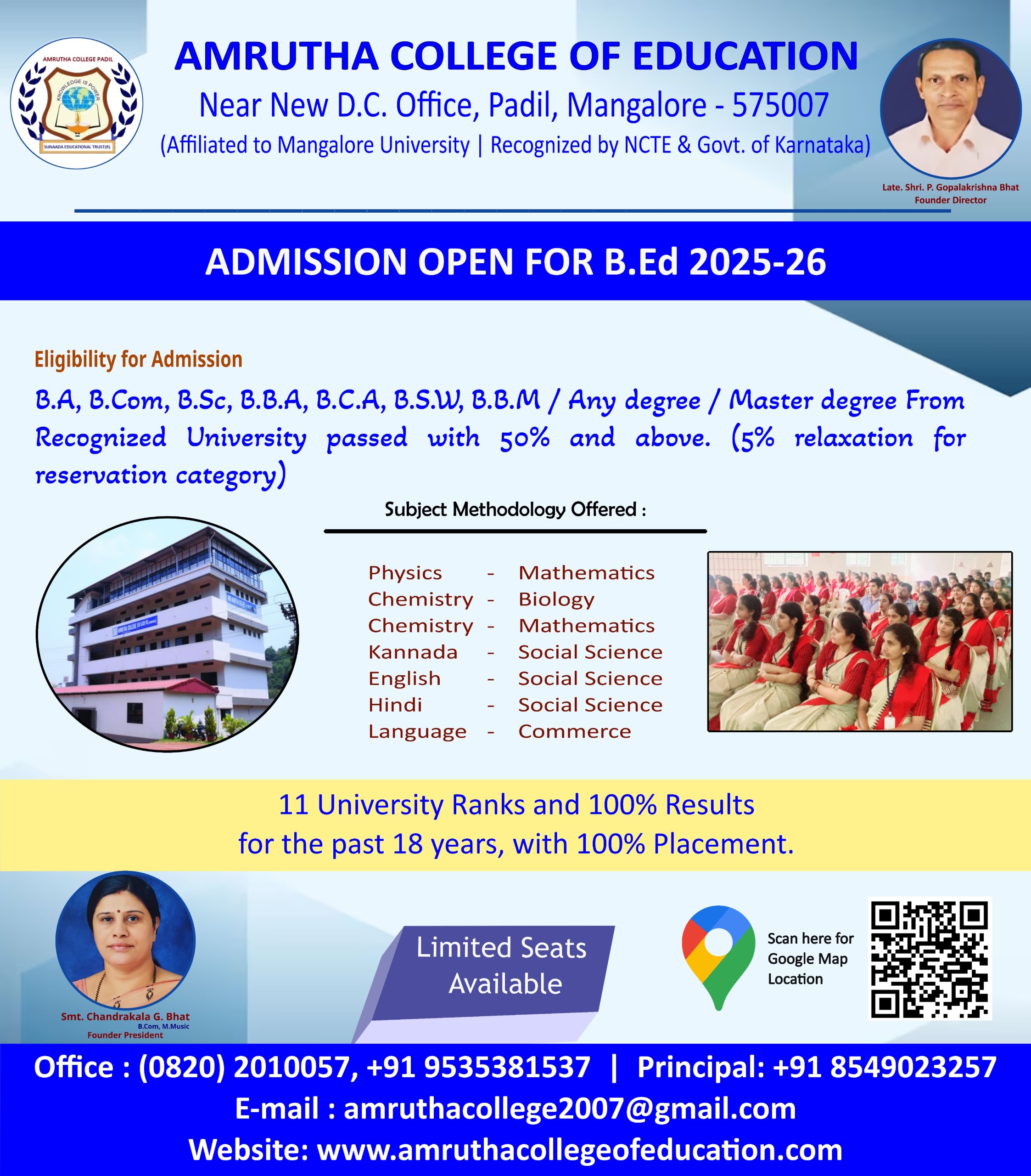 The institute is a co-educational, situated in calm, quiet and serene atmosphere. The Institute enjoys the unique advantage of a peaceful academic environment. It provides ample scope for enriching the social systems with diversified cultural heritage of Karnataka and especially of Mangalore through proper education and training. Amrutha College provides PUC (Science,Commerce,Arts), BCA, BBM, B.Com & B.Ed.